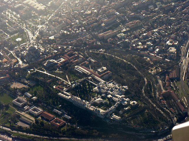 إلى جانب هذا التراث البيزنطي القديم، وعلى مبعدة خطوات منه يشمخ «الجامع الأزرق»، أو ما يعرف باسم جامع السلطان أحمد، شيد في القرن السابع عشر الميلادي، قبابه المتداخلة الضخمة كما مآذنه الست، تظهر بوضوح تأثر هندسته بكنيسة «آيا صوفيا» التي تبعد أمتارا قليلة عنه. ويروى أن السلطان أحمد مول بناء المئذنة السابعة في المسجد الحرام، كي يتسنى له بناء 6 مآذن، مع احترامه لتمايز المسجد الحرام. كل الترتيبات اتخذت لزيارة السياح لهذا المسجد المميز بإضاءته التي حافظت على نمطها القديم، كما السيراميك الذي يغطي جدرانه، وقبابه التي تجعل سقفه فرجة لمن يتذوق الفن المعماري. يطلب من الزوار خلع نعالهم، ويفرض على النساء الغطاء مع السماح بالشعر المكشوف. شيء من المصالحة بين علمانية تركيا وهويتها الإسلامية التي يعتز بها الأتراك ويفاخرون.
