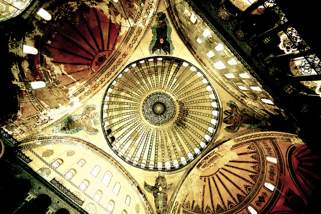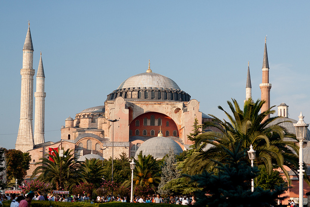 لا يستطيع الزائر أن يمنع نفسه من المقارنة بين قباب «آيا صوفيا»، وقباب «الجامع الأزرق»، لا سيما وأن المبنيين متقاربان جغرافيا، ويمكن للعين أن تتنقل بينهما. فالثاني شيد من وحي الروعة الهندسية لهذه الكنيسة التي بناها للمرة الأولى فسطنطين الكبير في القرن الرابع الميلادي، وللمرة الثانية في القرن الخامس. أما المبنى القائم اليوم فهو يعود للقرن السادس، حيث بقي كنيسة ما يقارب 900 سنة ليتم تحويلها إلى جامع بعدها، واستمر هذا الصرح مسجدا 480 سنة، حتى قرر أتاتورك عام 1935 أن يحوله متحفا، منهيا حالته الدينية، ليصير قبلة للسياح، يعني لأتباع كل دين ما يعنيه. وأجمل ما يراه الزائر داخل آيا صوفيا الفسيفساء والرسوم الدينية المسيحية إلى جانب الآيات القرآنية، وعمود الحظ الذي يقف السياح أمامه في طابور طويل ليدخل كل سائح إصبعه في ثقب حفر فيه، لشدة ما لمسته وجورته أصابع البشر، إيمانا منهم بقصة قديمة تقول إنه يجلب لمن يلمسه السعد.