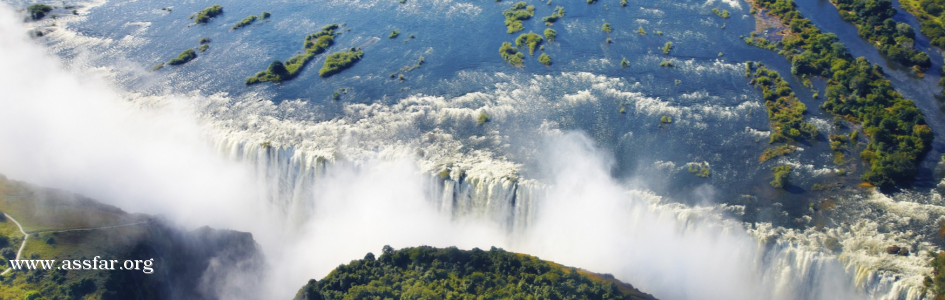 شلالات فيكتوريا victoria falls : بزامبيا و زيمبابوي ، و شلالات فيكتوريا هي دون أدنى شك بين الشلالات المدهشة و المذهلة في العالم ، جنبا إلى جنب مع بويرتو اجوازو و شلالات نياجارا . و هي تقع على نهر زامبيزي على الحدود بين زامبيا و زيمبابوي في جنوب أفريقيا ، و هي تمتد على عرض 1.7km و على إرتفاع 108 متر (355 قدم) و يبلغ متوسط التدفق من 1 مليون لتر في الثانية الواحدة ، و كانت قد أعلنت في أحد مواقع التراث العالمي لليونسكو في عام 1989
